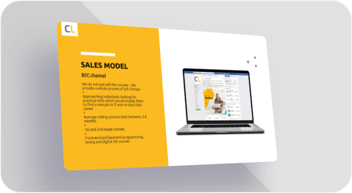 SALES MODEL B2C channel We do not just sell the courses . We provide a whole process of job change • Approachingindividuals lookingfor practical skills which would enable them to find a new job in IT and re-start their career • Average selling process lasts between 3-6 months • 1st and 2nd stage courses • Front-end and back-end programming, tesing and digital UX courses