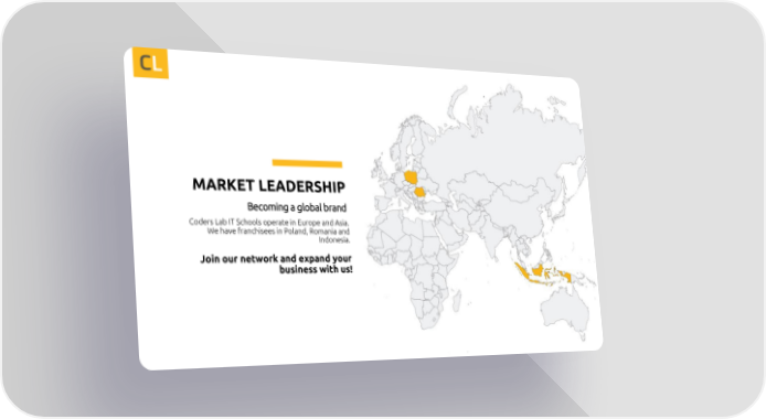 MARKET LEADERSHIP Becoming a global brand Coders Lab IT Schools operatein Europe and Asia. We have franchisees in Poland, Romania and Indonesia. Join our network and expand your business with us!