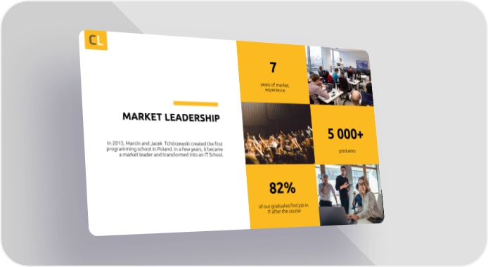 7 yearsof market experience MARKET LEADERSHIP 5 000+ In 2013, Marcin and Jacek Tchórzewski created the first programming school in Poland. In a few years, it became graduates a market leader and transformed into an IT School. 82% of our graduates find job in IT after the course
