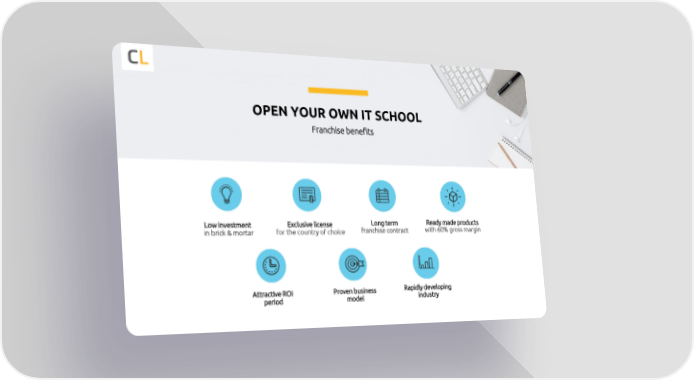 OPEN YOUR OWN IT SCHOOL Franchisebenefits Low investment Exclusive license Long term Ready made products in brick & mortar for the country of choice franchise contract with 60% gross margin Attractive ROI Proven business Rapidly developing period model industry