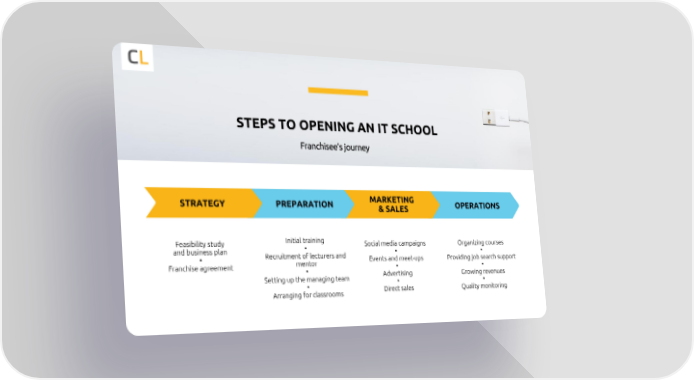 STEPS TO OPENING AN IT SCHOOL Franchisee’sjourney STRATEGY PREPARATION MARKETING OPERATIONS & SALES Feasibility study Initial training Social media campaigns Organizingcourses and business plan • Recruitmentof lecturersand • • • mentor Eventsand meet-ups Providing job search support Franchiseagreement • • • Advertising Growingrevenues Setting upthe managingteam • • • Direct sales Qualitymonitoring Arrangingfor classrooms